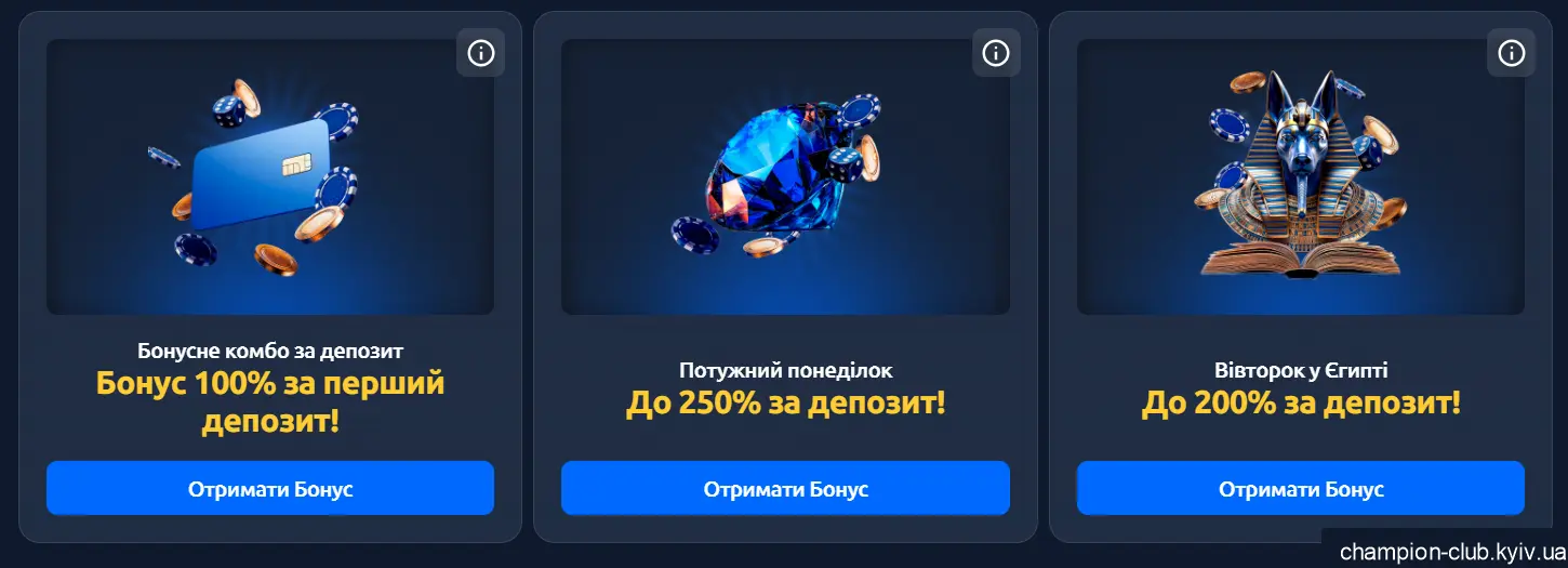 Champion Club дарує щедрі бонуси для нових та постійних користувачів, що дозволяють українським гравцям отримати ще більше від кожного депозиту та спіну. Наші акції роблять гру цікавою, азартною та прибутковою.