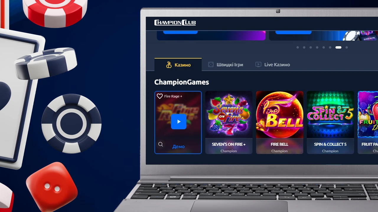Champion Club пропонує найширший вибір ігор на ринку України. Кожен користувач знайде для себе щось цікаве: класичні слоти, ігри з живими дилерами, Megaways, Hold 'n' Link та інші популярні механіки. Всі ігри проходять сертифікацію, щоб гарантувати чесність. Нові українські користувачі можуть випробувати демо-версії слотів перед грою на реальні гроші, а досвідчені гравці оцінять різноманіття тематик та бонусних функцій.